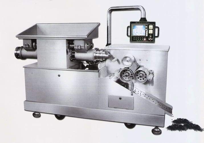 Drug material mixed equally is thrown into material drainage to pass pressing drug turnover plate of entering drug cavity, and the machine will thrust out many identical diameter drug sticks by squeezing of the helix of propelle. Under the control of self-control lidler pulley, the drug sticks enter into making pill knife in-phase, big and small equal water(concintration) pills will be twisted continuously.