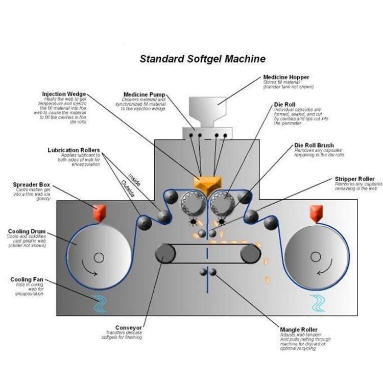 Soft gelatin encapsulation production line, adopts international advanced control technology, precise design, precise manufacturing and finished the line, it is the stable and dependable tool for the high quality soft capsule production at present.