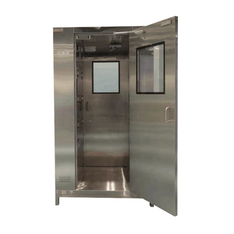 Air shower consists of cabinet, stainless steel door (cold steel), pre-filter, HEPA filter, pan, plenum chamber, nozzle, interlocking control panel, operation panel, sensing equipment, etc.