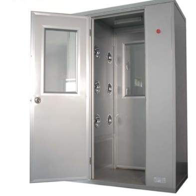 Air shower consists of cabinet, stainless steel door (cold steel), pre-filter, HEPA filter, pan, plenum chamber, nozzle, interlocking control panel, operation panel, sensing equipment, etc.